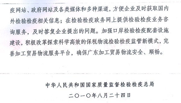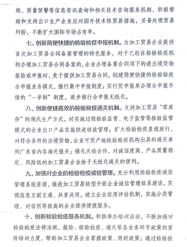 各地級以上市人民政府,省政府各部門、各直屬機構(gòu): 近日,國家質(zhì)檢總局根據(jù)廣東出入境檢驗檢疫局調(diào)研意見,出臺了《國家質(zhì)檢總局關(guān)于促進廣東省加工貿(mào)易轉(zhuǎn)型升級的檢驗檢疫措施的通知》(國質(zhì)檢通〔2010〕456號),支持我省建設(shè)全國加工貿(mào)易轉(zhuǎn)型升級試驗區(qū)。根據(jù)省政府領(lǐng)導(dǎo)意見,現(xiàn)將國質(zhì)檢通〔2010〕456號文轉(zhuǎn)發(fā)給你們,請認真組織學(xué)習(xí)宣傳,配合做好相關(guān)工作。同時,各地、各部門要借鑒國家質(zhì)檢總局和廣東出入境檢驗檢疫局的做法,積極采取有效措施,為加工貿(mào)易企業(yè)轉(zhuǎn)型升級提供優(yōu)質(zhì)、高效的服務(wù)。