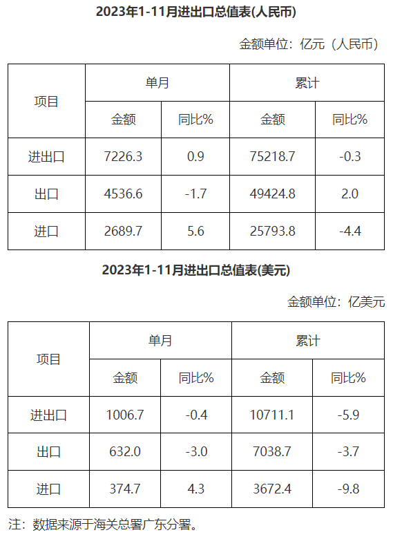 廣東省外貿(mào)進(jìn)出口總值表(2023年1-11月)