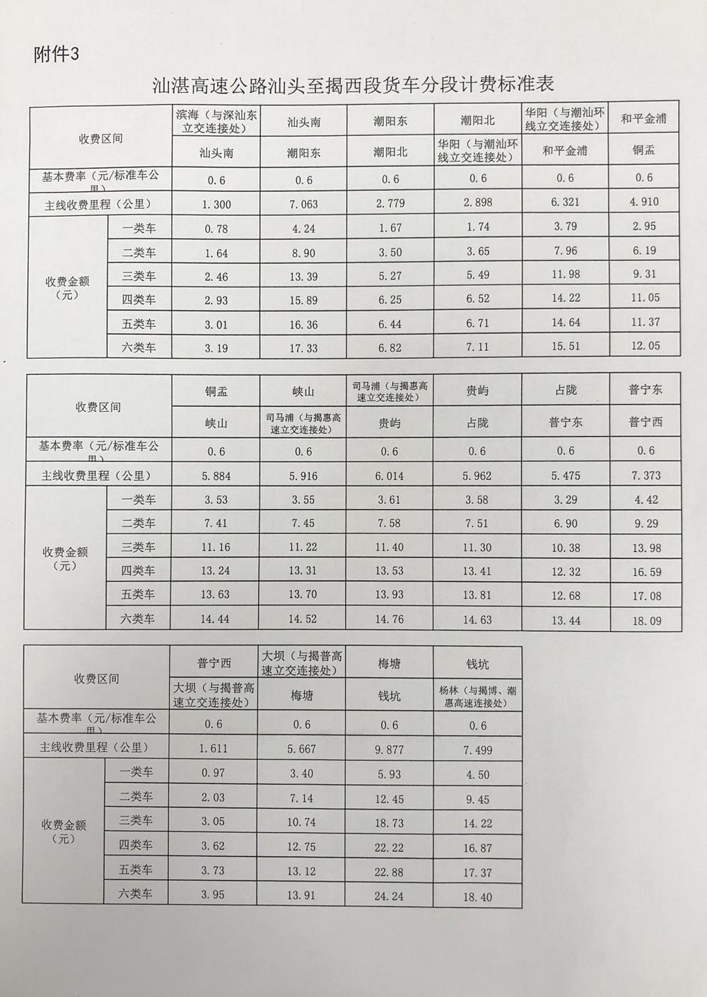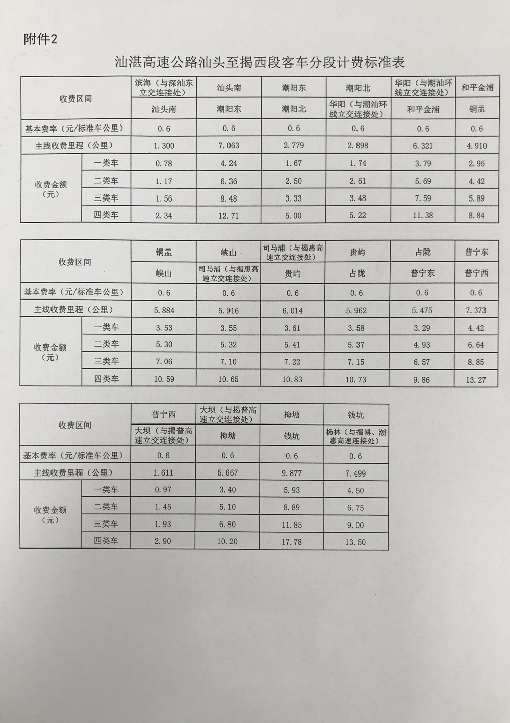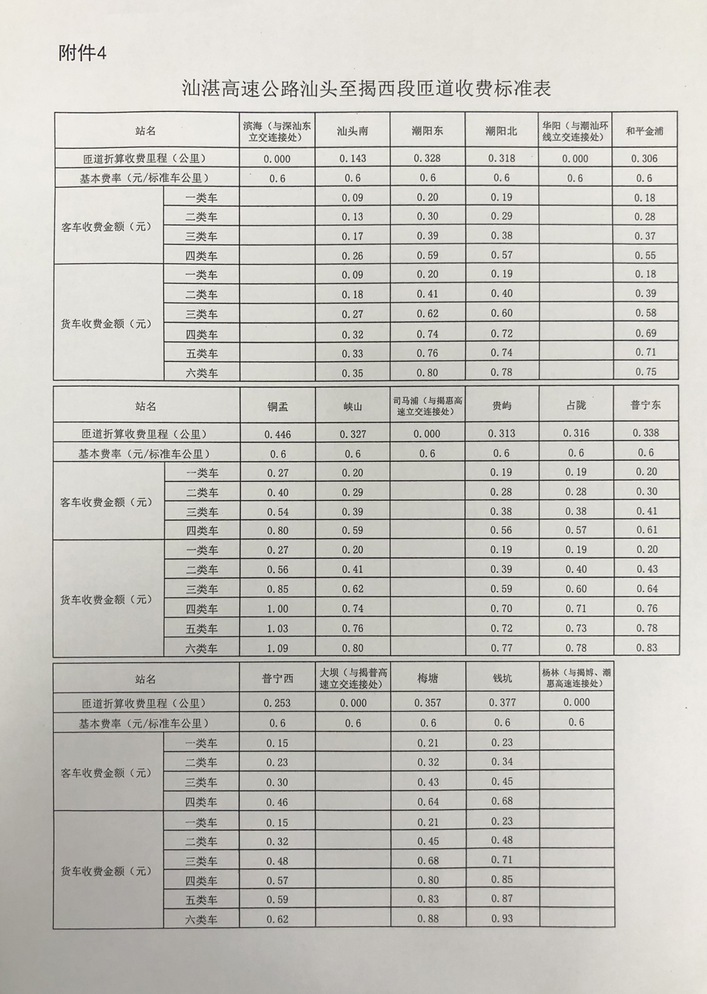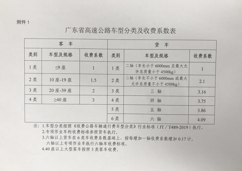 粵交營〔2020〕421號請示收悉。同意汕湛高速公路汕頭至揭西段交工驗收通車和收費設施經驗收符合聯網收費技術要求后開始收費,收費車型執行《收費公路車輛通行費車型分類》(JT/T489-2019),收費費率為0.6元/標準車公里,1至4類客車的收費系數分別為1、1.5、2、3,1至6類貨車的收費系數分別為1、2.1、3.16、3.75、3.86、4.09,專項作業車的收費標準參照貨車執行。